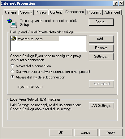 If myomnitel.com does not say Default next to it in the box at the top, click once on it then click on the Set Default button. Click the Settings button.