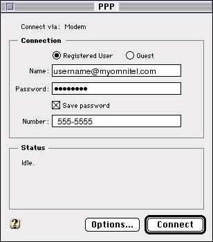 2. Make sure you have username@myomnitel.com in the Name box, as well as the password OmniTel Communications assigned you in the Password box. Be sure that the Save password box is checked. Then verify that the phone number that appears in the Number box is your local access number. Click the close box and save your changes.